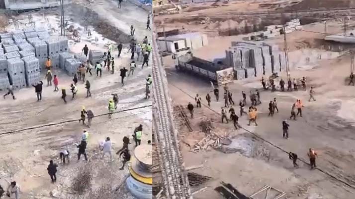 Onlarca işçinin karıştığı kavga, çevredekiler tarafından cep telefonu kamerasıyla görüntülendi.