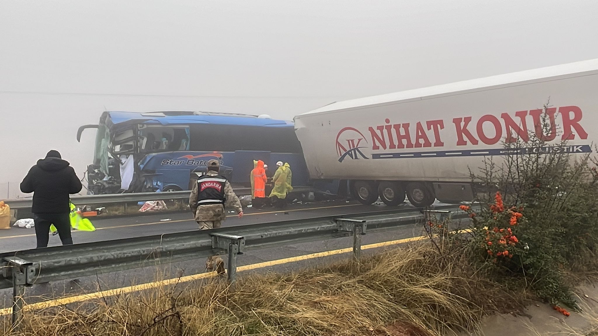 Yoğun sisin ve yağmurun etkili olduğu Şanlıurfa-Gaziantep otoyolu bağlantı yolunda yolcu otobüsüyle aynı yöne seyir halindeki TIR'lar çarpıştı.