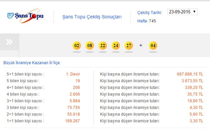 Şans Topu oyununun 745. hafta çekilişi yapıldı. Milli Piyango İdaresi Genel Müdürlüğünce düzenlenen oyunun bu haftaki çekilişinde kazandıran numaralar 2, 8, 22, 24, 27 ve artı 4 olarak belirlendi.