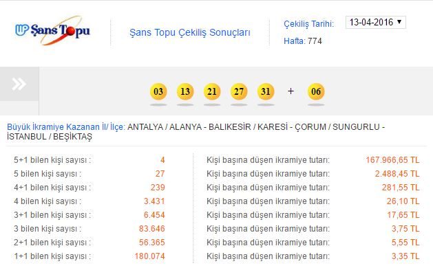 13 Nisan 2016 Şans Topu çekilişinde ikramiye dağılımı şu şekilde gerçekleşti; 5 bilen 27 kişi 2 bin 488 lira kırk beşer kuruş, 4+1 bilen 239 kişi 281 lira elli beşer kuruş, 4 bilen 3 bin 431 kişi 26 lira onar kuruş, 3+1 bilen 6 bin 454 kişi 17 lira altmış beşer kuruş, 3 bilen 83 bin 646 kişi 3 lira yetmiş beşer kuruş, 2+1 bilen 56 bin 365 kişi 5 lira elli beşer kuruş, 1+1 bilen 180 bin 74 kişi 3 lira otuz beşer kuruş ikramiye almaya hak kazandılar.