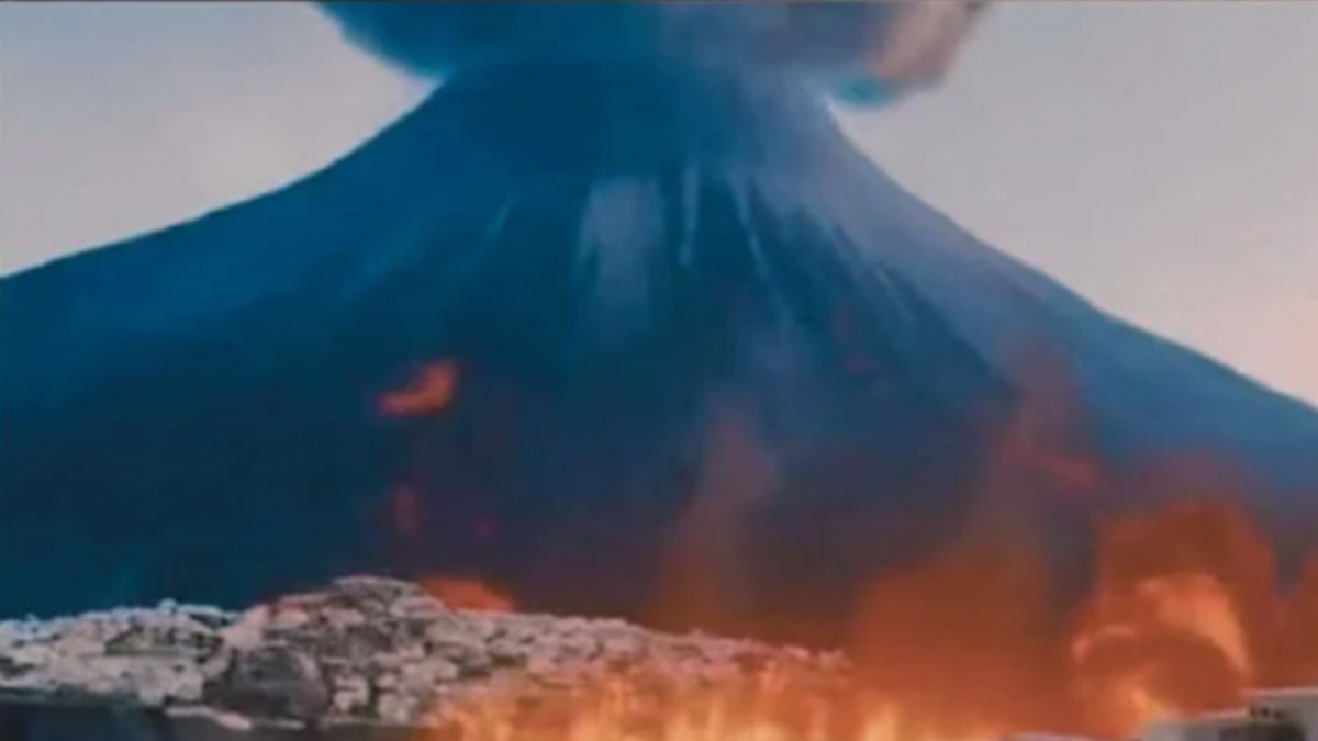 Videoda, Santorini Yanardağı şiddetli bir şekilde patlıyor ve Kiklad Adaları'nda yıkıma yol açıyor.