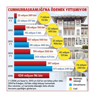 Bütçe tasarısı ve gerçekleşme verilerine göre, Cumhurbaşkanlığı 2015 yılında kendisine ayrılan 397 milyon liralık başlangıç ödeneğinin tam 74 milyon 240 bin lira üzerinde harcama yaparak yılı 471 milyon 631 bin lirada kapattı. 2014 yılında da başlangıç ödeneğinin 45 milyon lira üzerine çıkılmıştı. Ödeneklerdeki hızlı artışın kamuoyunda dikkat çekmesi, Cumhurbaşkanlığı bütçesinin başlangıç ödeneklerinde farklı uygulamaya gidilmesine yol açtı. 2015 yılında saray bütçesinden 471.2 milyon lira harcanmasına rağmen 2015 yılında bu tutarın daha altında olan 434 milyon liralık başlangıç ödeneği yazıldı. Böylece saray bütçesi 500 milyon liraya yaklaşmış oldu. Yıl içerisinde ortaya çıkacak ilave ödenek ihtiyacının ek ödenekle karşılanacağı belirtiliyor.