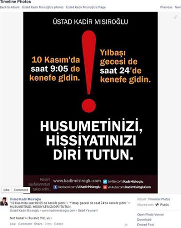 Erdoğan’ın damadının kardeşinin yöneticisi olduğu A Haber televizyon kanalında yaptığı tarih programlarıyla bilinen İslamcı yazar Kadir Mısıroğlu, 10 Kasım nedeniyle paylaştığı bir mesajda Atatürk'e hakaret etmiş ve resmi Facebook sayfasından paylaştığı afişe "10 Kasım'da saat 09:05'te kenefe (tuvalete) gidin" diye yazmıştı.