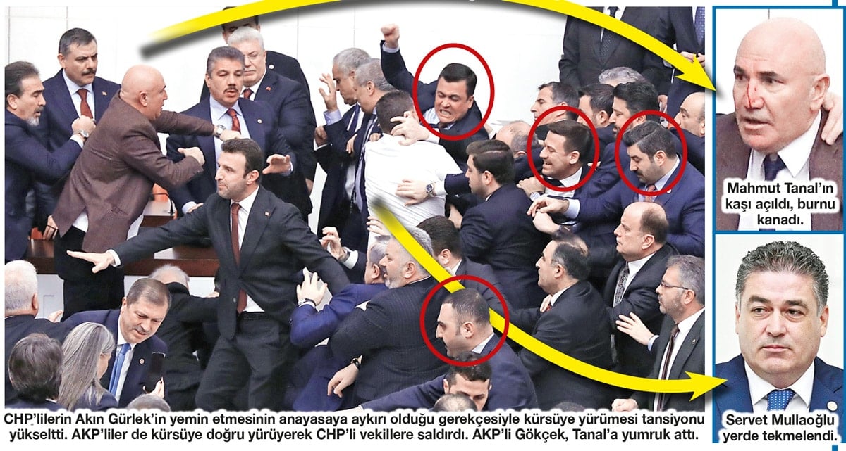 CHP Grup Başkanvekili Murat Emir söz alıp Gürlek’in atanmasına karşı çıktı. Emir, “Gürlek’in yemin etmesi Anayasa’ya aykırı, Başsavcılık görevi devam ediyor” diye itiraz etti. Ancak Meclis Başkanvekili Bekir Bozdağ, Gürlek’in yemin etmesine bir engel olmadığını belirtti. Bunun üzerine CHP milletvekilleri kürsü önünde toplandı, AKP’liler uzaklaştırmak istedi ve AKP’liler CHP’li vekillere saldırınca kavga çıktı.