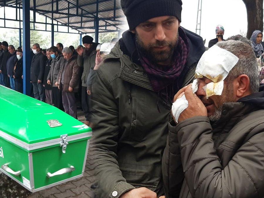 Gaziantep'in İslahiye ilçesinde meydana gelen kazada yüzü gözü kanlar içerisinde kalan ve o haliyle jandarmanın yanına gelerek, kendisine çarpan TIR'ın sürücüsünün yakalanıp yakalanmadığını soran motosiklet sürücüsü Hüseyin A., bugün ise aynı kazada ölen karısının cenazesini yüzü sargılı halde gözyaşları ile karşıladı.