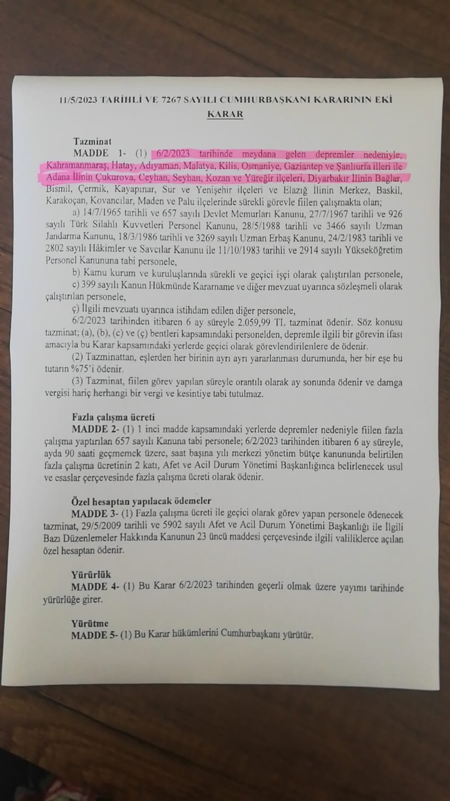 Bilindiği üzere hükümet Cumhurbaşkanlığı Kararnamesi doğrultusunda 11 Mayıs 2023 tarihinde yayınlanan kararnameye göre Türkiye'de depremden etkilenen 11 ilde ve buna bağlı ilçelerde yaşayan kamu personeline tazminat ve deprem sebebiyle Fazla çalışma ücreti ödeme kararı almıştı.