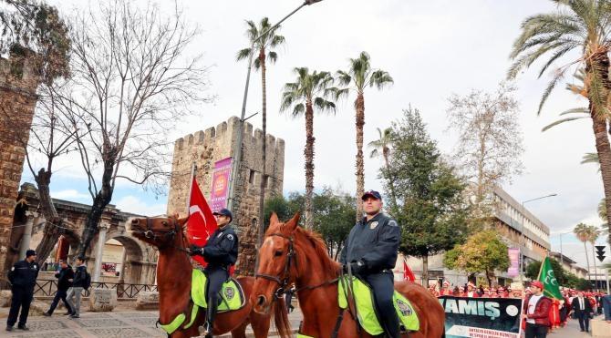 'Vefakar Gençlik Fedakar Ecdadını Unutmayacak' sloganıyla, Gençlik ve Spor Bakanlığı tarafından 81 ilde gerçekleştirilen Sarıkamış Yürüyüşü'nün Antalya'daki töreni, Cumhuriyet Meydanı'nda başladı. Sarıkamış Harekatı'nın 102'nci yıl dönümü dolayısıyla düzenlenen etkinliğe, Antalya vali yardımcıları, Gençlik Hizmetleri ve Spor İl Müdürü Burhanettin Hacıcaferoğlu, İl Emniyet Müdürü Celal Uzunkaya ve öğrenciler katıldı. 100 metre bayrakla yürüyen yaklaşık 1500 kişi, Karaalioğlu Parkı'na kadar geldi. Atlı polislerin eskortluk ettiği yürüyüş sırasında ev ve işyerindekileri alkışlarla destek verdi.
