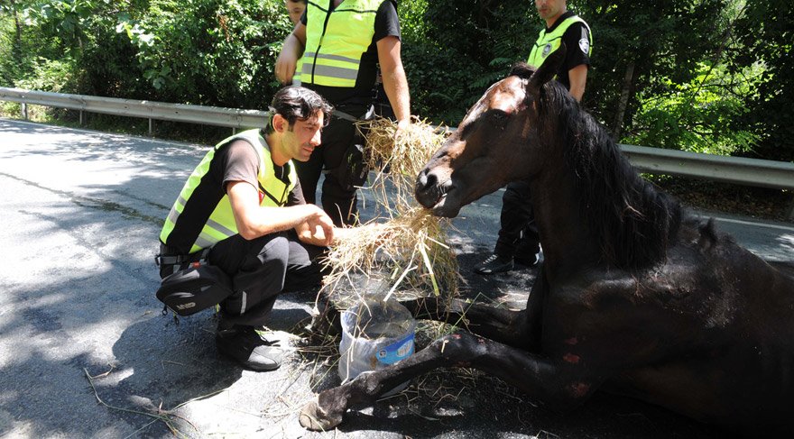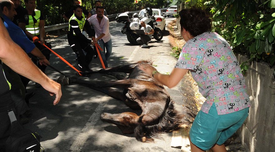 Yaralar içerisindeki at, yoldan geçen araçlardan ürkerek yeniden yol kenarındaki  su kanalına düştü. Düştüğü yerden kalkamayan ve sürekli kalkmak için çaba harcayan hayvan, başını duvara vurarak zor anlar yaşadı. Güneş altında, havasız kalan hayvana yoldan geçenler yardım etti. Vatandaşların ihbarıyla olay yerine yakında işyeri bulunan veteriner hekim Aslı Uğur Tekinel koştu.Hayvanın rahatça nefes almakta güçlük çektiğinin anlaşılması ile yaralı at çevre sakinleri, Sarıyer Belediyesi Zabıta Ekipleri ve gönüllülerin uzun süren çalışması sonucu, su kanalından çıkarıldı.Hayvana yem ve su verildi.