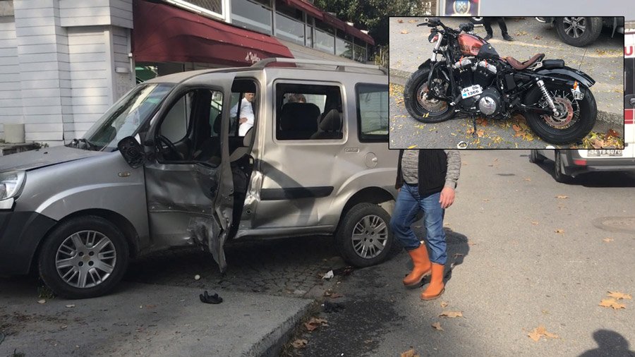 Güvenlik kameralarına yansıyan görüntülerde, hafif ticari aracın sürücüsü aracına binerek caddede “U” dönüşü yapıyor. O esnada motosiklet sürücüsü araca çarpıyor. Çarpmanın etkisiyle motosiklet takla atarken, üzerindeki kadın sürücü yere savruluyor. Sürücü de aracın altına giriyor. Araç sürücüsü ise dönmeye devam ediyor. O esnada aracın altında sıkışan adam metrelerce sürükleniyor. Valeler koşarak araç sürücüsünü uyarıyor. Altında birinin olduğunu fark eden sürücü duruyor.