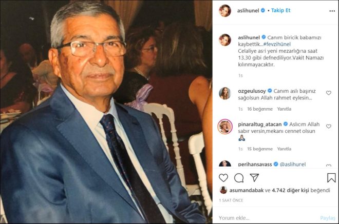Aslı Hünel acı haberi Instagram hesabından böyle duyurdu: "Canım, biricik babamızı kaybettik. Celaliye eski mezarlığına saat 13.30 gibi defnediliyor. Vakit namazı kılınmayacaktır."