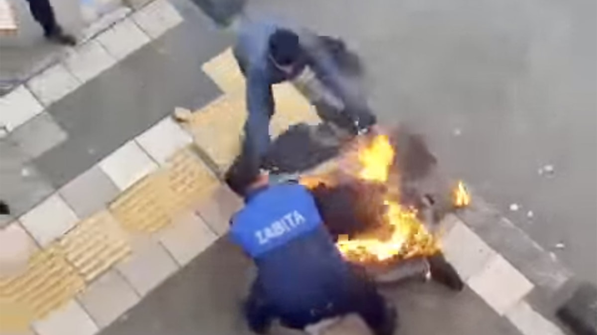 Bir süre sonra H.Y., yanında bulunan benzin dolu şişeyi başından aşağıya boşalttı. Çevredeki vatandaşların ve zabıtaların ikna çabalarına rağmen kendini ateşe veren seyyar satıcı yanmaya başladı.