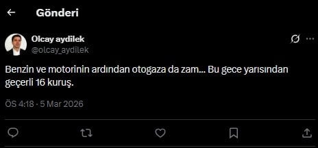 Gazeteci Olcay Aydilek, bu gece yarısından itibaren geçerli olacak şekilde otogaza 16 kuruşluk zam geleceğini açıkladı.