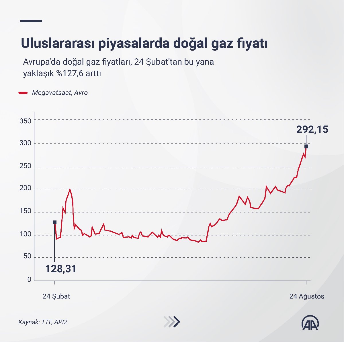 Avrupa'da en fazla derinliğe sahip Hollanda merkezli sanal doğalgaz ticaret noktası TTF'de işlem gören mart vadeli kontratların fiyatı 24 Şubat'ta 1365 dolardı. Dün 1000 metreküp başına 1894 avrodan açılan eylül vadeli kontratların fiyatı, günü 1000 metreküp başına 3106 dolardan tamamladı. Böylece, savaşın başından bu yana dün en yüksek kapanış seviyesine ulaşan doğalgaz fiyatı, 6 ayda yüzde 127,6 artış gösterdi.