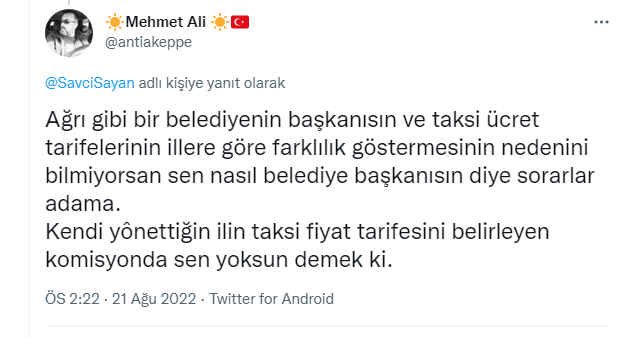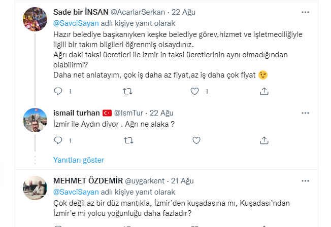 Başka bir yorumda Savcı Sayan’a “Hazır Belediye Başkanıyken keşke belediye görev, hizmet ve işletmeciliğiyle ilgili bir takım bilgileri öğrenmiş olsaydınız. Ağrı’daki taksi ücretleri ile İzmir’in taksi ücretlerinin aynı olmadığından olabilir mi? Daha net anlatayım, çok iş daha az fiyat, az iş daha çok fiyat “diye yazılırken, bir başkası ise “İki farklı şehrin kilometresini ve nüfus yoğunluğunu, iş yapan taksici esnafın elde edeceği kişi başına gelirini, geçinme indeksini falan bilmiyorsan, gerçekten anlamayarak soruyorsan Belediye Başkanlığını bırak kardeşim. Hatta ilkokul 1’nci sınıftan eğitime yeniden başla” yorumunda bulundu.