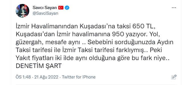 Sayan, “İzmir Havalimanından Kuşadası’na taksi 650 TL, Kuşadası’ndan İzmir Havalimanına 950TL yazıyor. Yol, güzergah, mesafe aynı. Sebebini sorduğunuzda Aydın Taksi tarifesi ile İzmir Taksi tarifesi farklıymış. Peki yakıt fiyatları iki ilde aynı olduğuna göre bu fark niye? Denetim şart” diye yazınca sosyal medyada alay konusu oldu.