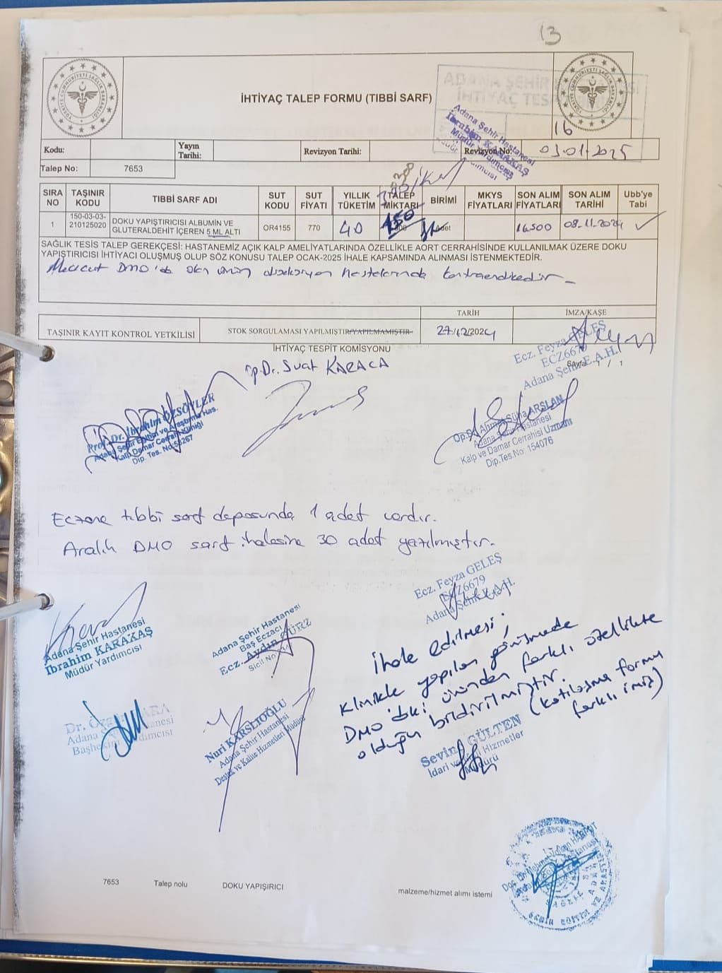 Hastane idaresi istemde bulunup yıllık kullanım gereksinmesini 40 adet olarak belirliyor. Doku yapıştırıcısına yıllık olarak 40 adet ihtiyaç duyan Adana Şehir Hastanesi, sonra sayıyı artırma ihtiyacı duyuyor. 40 alım sayısını 300’e çıkaran hastane alım komisyonu, evraklardaki miktarları artırıp üzerlerine paraf yaparak alımı gerçekleştiriyor. Türkiye genelindeki diğer Şehir Hastanelerinin bu doku yapıştırıcı alımlarının sayısı 10 ila 15’i geçmediği belirtiliyor. Miktar artırılırken SUT (Sağlık Uygulama Tebliği) fiyatı 770 lira olarak gözüken doku yapıştırıcısı için toplamda 16 bin 500 lira ödeniyor. Alım komisyonu da bunu resmi evrakla olur vererek gerçekleştiriyor. Kalp doktorları bu alımı yapılan doku yapıştırıcısının 300 adet alınmasının yanlış olduğuna işaret ediyorlar.