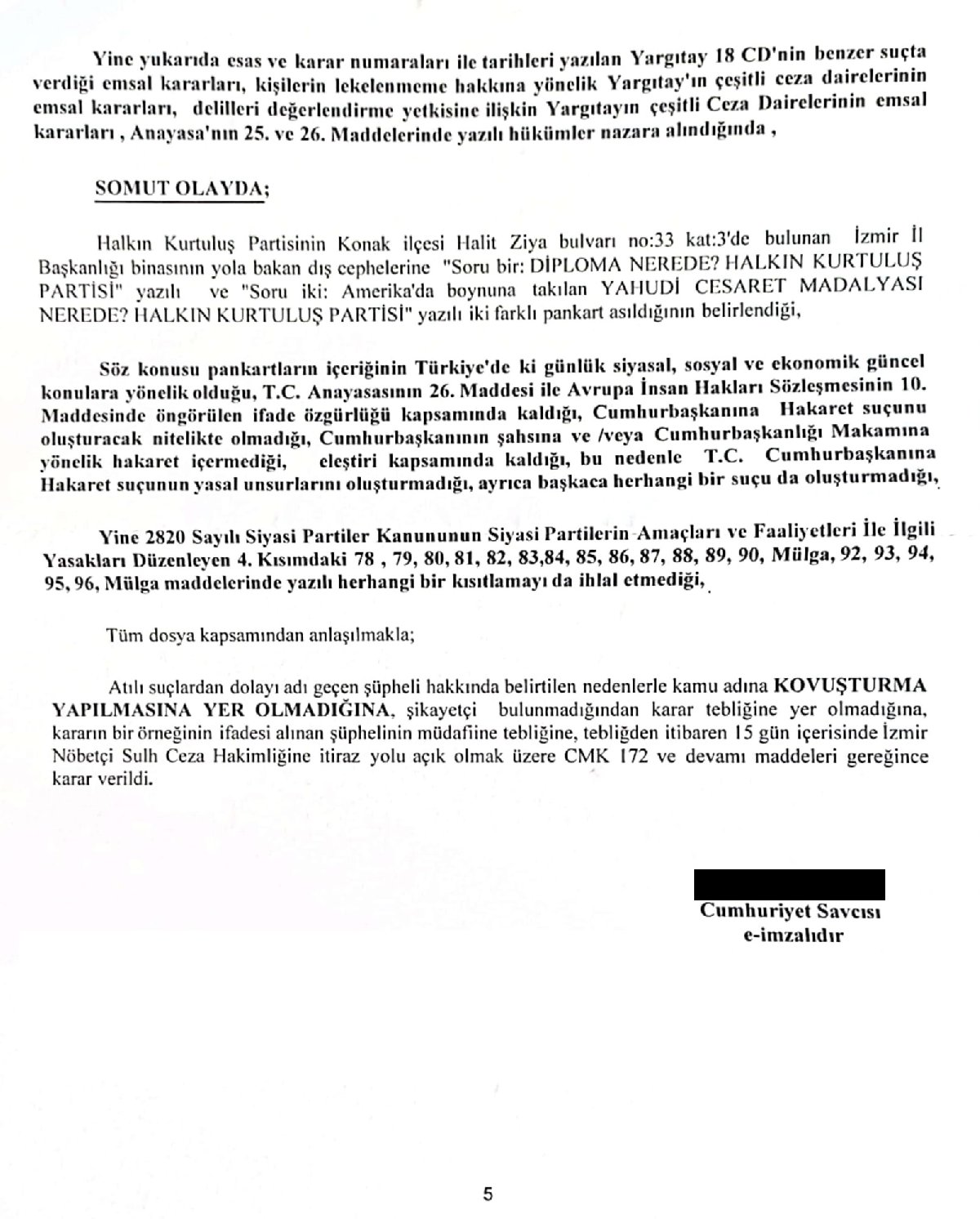 “Söz konusu pankartların içeriğinin Türkiye’de ki günlük siyasal, sosyal ve ekonomik güncel konular yönelik olduğu, T.C. Anayasasının 26. Maddesi ile Avrupa İnsanları Sözleşmesinin 10. Maddesinde öngörülen ifade özgürlüğü kapsamında kaldığı, Cumhurbaşkanına Hakaret suçunu oluşturacak nitelikte olmadığı, Cumhurbaşkanının şahsına ve/veya Cumhurbaşkanlığı Makamına yönelik hakaret içermediği, eleştiri kapsamında kaldığı, bu nedenle T.C. Cumhurbaşkanına Hakaret suçunun yasal unsurlarını oluşturmadığı, ayrıca başkaca herhangi bir suçu da oluşturmadığı,