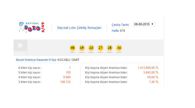 8 Ağustos 2015 Cumartesi tarihli Sayısal Loto çekilişinde 3 milyon 720 bin 934 lira 50 kuruş ikramiye dağıtıldı. Hasılattan kamuya, KDV olarak 1 milyon 480 bin 78 lira 68 kuruş, Şans Oyunları Vergisi olarak da 826 bin 874 lira 33 kuruş aktarılacak.