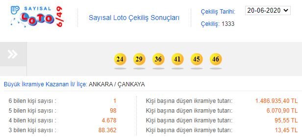 SAYISAL LOTO SONUÇLARI 20 HAZİRAN