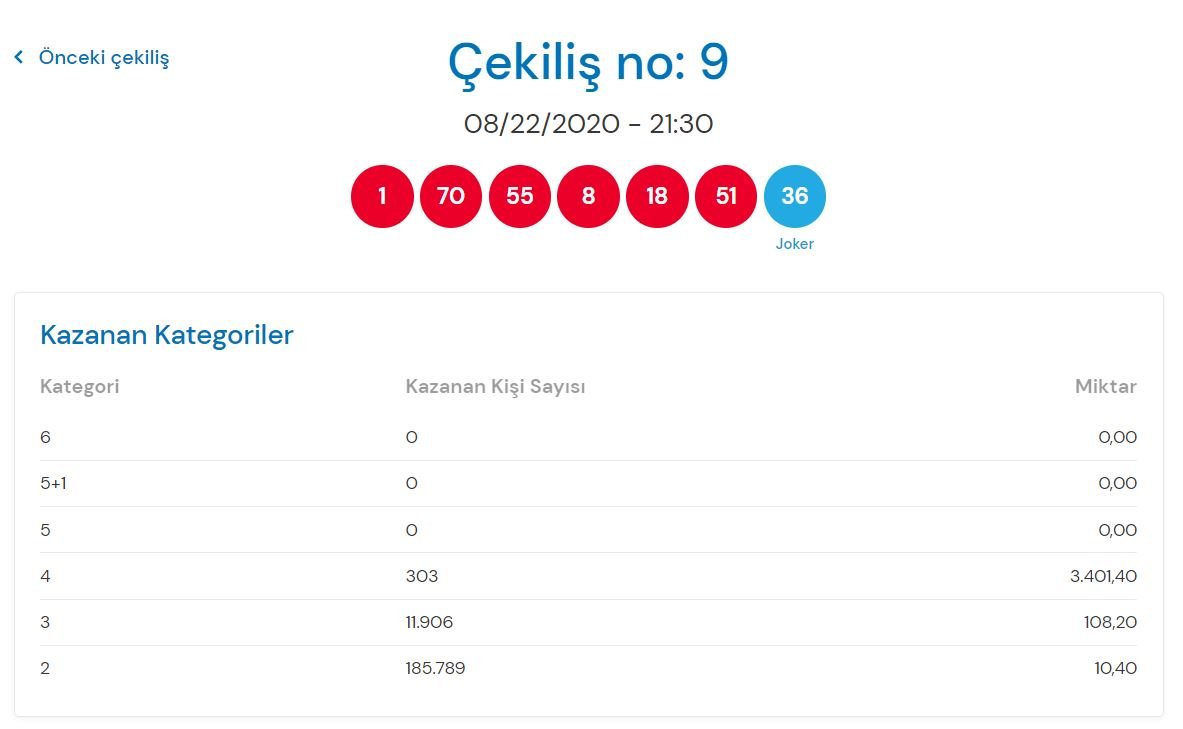 Kazanan numaralar; 1-70-55-8-18-51 Joker 36