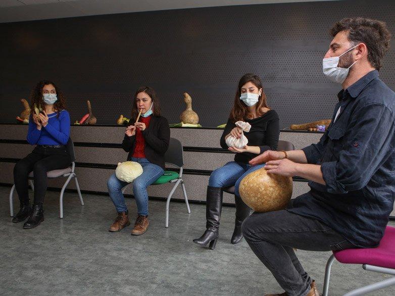 Su kabağı, pırasa, havuç, patlıcan gibi sebzeleri kullanarak çeşitli enstrümanların seslerini elde eden orkestra, Tohum Takas Şenliği’nde sergileyecekleri performansa hazırlanıyor.