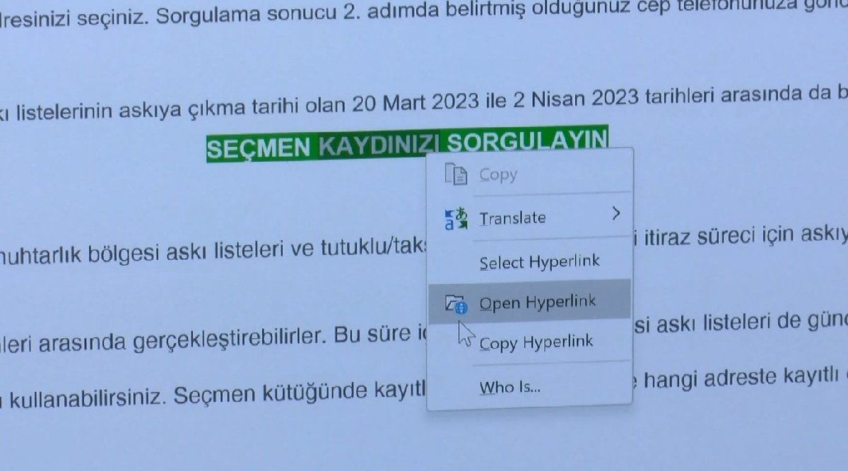 Dolandırıcılar tarafından "Yüksek Seçim Kurulu Seçmen Sorgulama Hizmeti" başlığıyla bir link gönderiliyor.