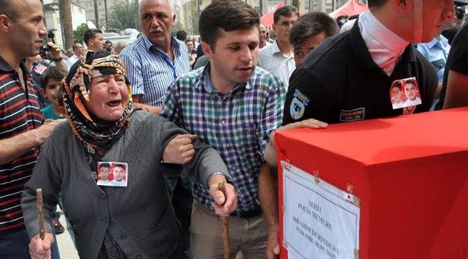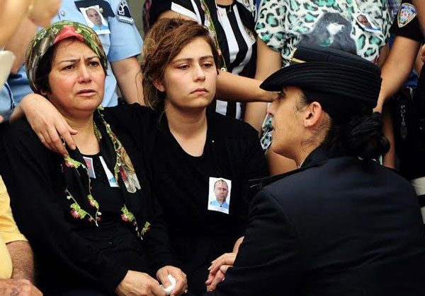 Valilikte düzenlenen törenin ardından polisler şehitlerin cenazelerini omuzlara alacağı sırada polis memuru İbrahim Derindere’nin eşi Şeyma, 2 yaşındaki kızı Hafize’yi kucaklayarak, “Kızım babana son kez dokun” diyerek Türk Bayrağına sarılı tabutun başına getirdi. 5 yaşındayken annesi Sebiha Palıt’ı kaybeden bekar olan şehit polis memuru Yalçın Palıt’ın halası Cennet de “Yavrum benim. Size nasıl kıydılar? Annenle buluşmaya mı gidiyorsun” diyerek ağıtlar yaktı. Şehidin kızkardeşi Elif Palıt ise “Ağabey beni bırakma” diyerek haykırdı.
