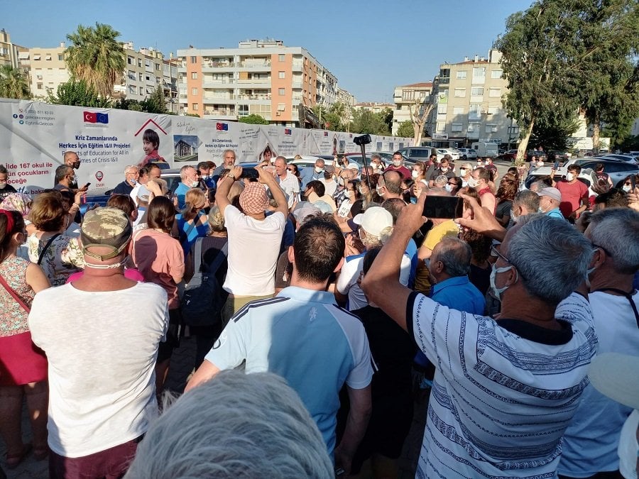 Recai Acar, “40 yıl önce imar planında eğitim alanı olarak işaretlendi. 2019’da arsa sahiplerine parası ödenerek kamulaştırıldı. Burada yıllardır lise ihtiyacı vardı. Kendi evlatlarımızın ihtiyacı göz ardı edilerek yabancılara veriliyor. İzmirliler bu tuzağa düşmeyecek ve sonuna kadar mücadele edecektir” dedi. Hale Birçakır da “Burada şehrimin siyasi parti ve belediye başkanlarını da görmek isterdim” siteminde bulundu.