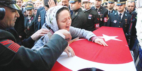 Giresunlu 23 yaşındaki Astsubay Çavuş Hakan Gemici’nin geçen 18 Ekim’de dünya evine girdiği Elif Gemici, cenazede metanetini korumaya çalıştı. Eşinin fotoğrafına ve beresine sarılan acılı kadını yakınları teselli etti. Şehidin annesi Fatma ve babası Kemal Gemici, oğullarının Türk Bayrağı’na tabutuna kapanarak gözyaşı döktü. Şehit Astsubay Hakan Gemici’nin cenazesi Altınpınar Köyü’nde sağanak yağmur altında toprağa verildi. (DHA)