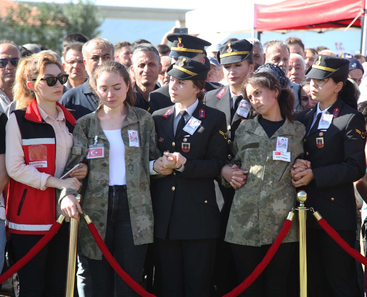 Alanda Şehit Kaya'nın annesi Şenay Kaya, kardeşi Eylül Kaya ve nişanlısı Emine Eker ayakta durmakta güçlük çekerken, baba Musa Menderes Kaya'ya Vali Turan Ergün eşlik etti.