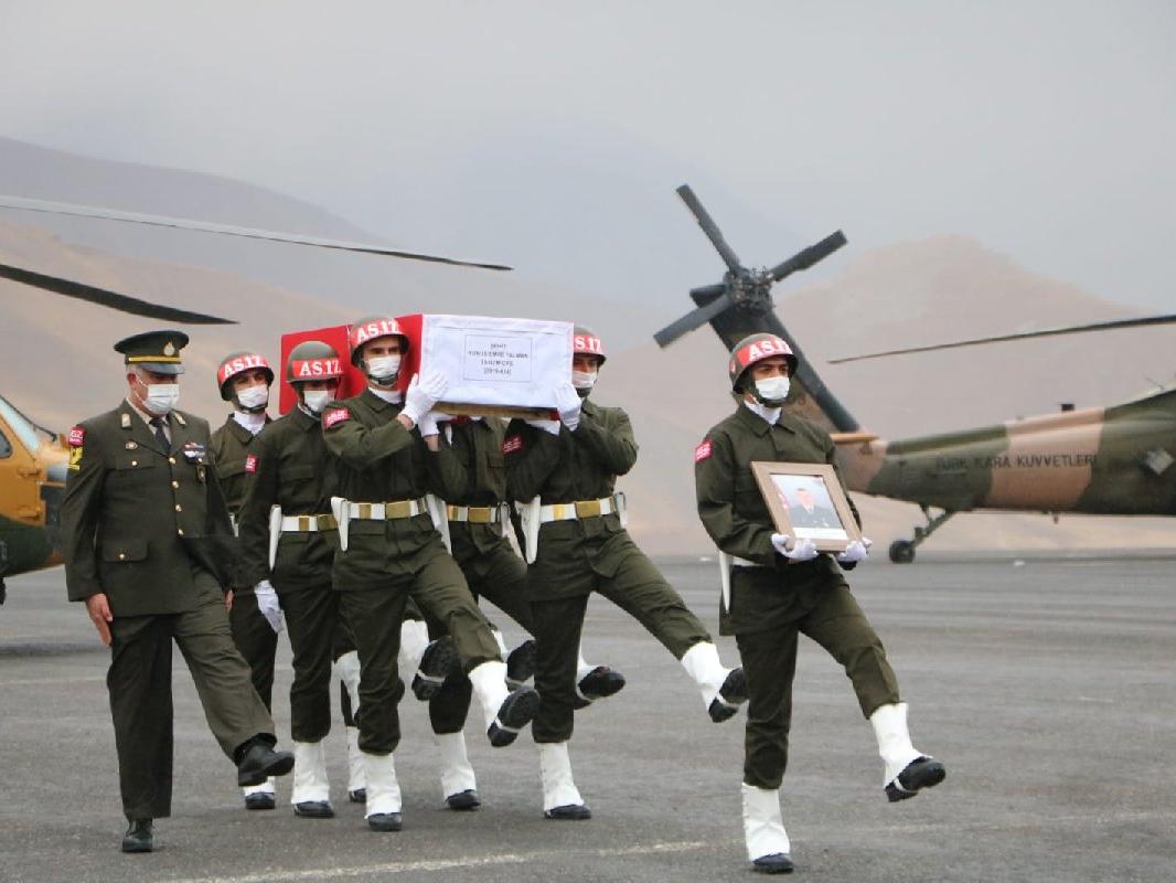 Irak'ın kuzeyinde devam eden Pençe- Yıldırım harekat bölgesinde PKK'lı teröristlerin tuzakladığı el yapımı patlayıcının infilak etmesi sonucu şehit olan İstihkam Uzman Çavuş Yunus Emre Yalman'ın cenazesi, Hakkari'de düzenlenen törenle memleketi Osmaniye'ye uğurlandı.