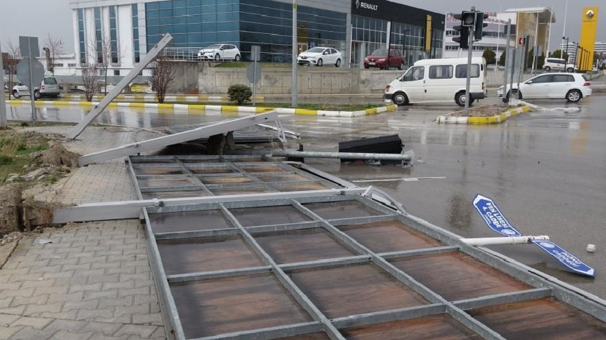 Çorum'da yağmurla birlikte etkili olan fırtına nedeniyle billboardlar ve trafik sinyalizasyon direkleri devrildi.