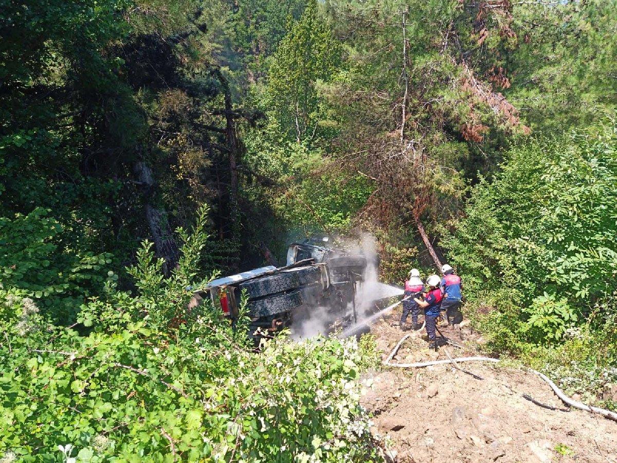 Kastamonu'da sel bölgesine köprü malzemesi götüren kamyon freninin boşalması sonucu şarampole yuvarlanarak alev aldı. Sürücü son anda araçtan atlayarak kurtuldu.