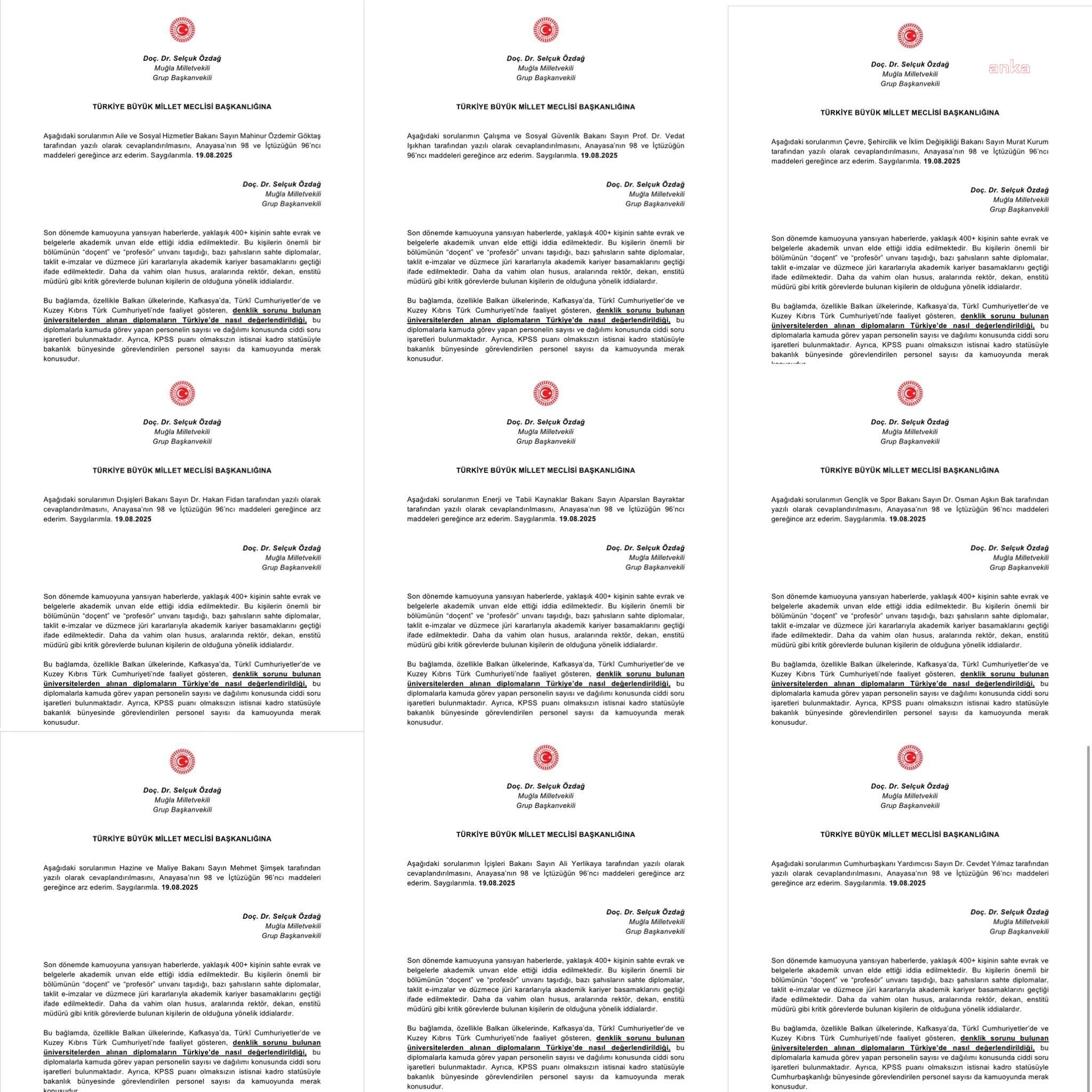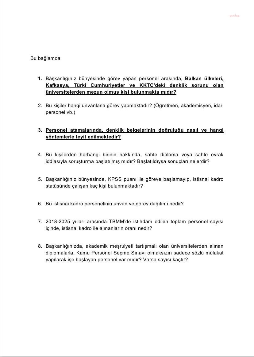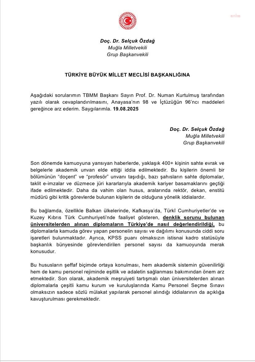 Selçuk Özdağ, yurt dışındaki denklik sorunu olan bazı üniversitelerden alınan diplomalarla Türkiye’de kamu görevine girilmesine dikkat çekti. Bu diplomaların geçerliliğinin nasıl değerlendirildiği, hangi prosedürlerin uygulandığı ve şu an kamuda bu yolla görev yapanların sayısı gibi konuların netleşmesi gerektiğini söyledi.