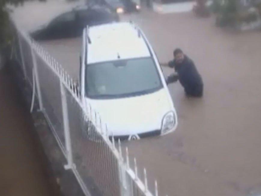 Aynı mahallede sele kapılan aracını gören bir vatandaş ise sel sularına aldırış etmeden aracının yanına gitti. İlk olarak sel sularıyla sürüklenen aracını durdurmaya çalışan vatandaş bu girişiminde başarılı olamadı. Sel sularının 1 metreyi aştığını gören vatandaş daha sonra sudan çıktı. Suların iyice yükselmesiyle birlikte kendi aracının da yan döndüğünü gören adam tekrar suya girerek tonlarca ağırlıktaki aracını elleriyle itmeye başladı. Park ettiği yere bu sefer elleriyle düzgün bir şekilde aracını iten vatandaş bir müddet aracını tuttuktan sonra yan tarafta bulunan cami duvarına çıktı. Duvarın üzerinde sel sularından kaçmaya çalışan vatandaşın bir yandan da aracını tutmaya çalışması sel felaketinin boyutlarını gözler önüne serdi. Aracını sıkı sıkı tutan adam daha sonra hızlı bir şekilde karşıya geçerek bir ip bulup aracının yanına döndü. İple aracını sıkı sıkı caminin demir korkuluklarına bağlayan vatandaş aracının sürüklenmesini engelledi.