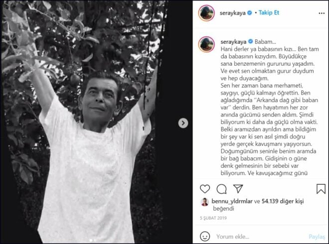 "Belki aramızdan ayrıldın ama bildiğim bir şey var ki sen asıl şimdi doğru yerde gerçek kavuşmanı yaşıyorsun. Doğum günüm seninle benim aramda bir bağ babacım. Gidişinin o güne denk gelmesinin bir sebebi var biliyorum. Ve kavuşacağımız günü bekliyorum."