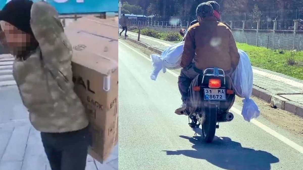 Depremin en büyük hasarı verdiği ikinci kent olan Hatay'da çaresizlik içinde kalan bir vatandaş, depremde can veren yakınının cenazesini motosikletle defnetmeye götürürken görüntülendi.