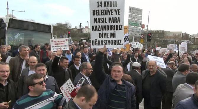 "Plaka istedik sadaka değil", "Plaka hakkımız söke söke alırız", "Esnaf burada Kadir Topbaş nerede" sloganları atan servisçiler, üzerinde "UKOME kararı. Ruhuna Fatiha" yazan temsili siyah tabut taşıdı.