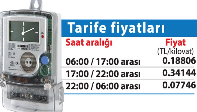 “3 zamanlı tarife” adı verilen sistemle sabah 06.00’dan akşam 17.00’ye kadar kilovat başına 0.18 lira, akşam 17.00’den gece 22.00’ye kadar 0.34 kuruş, 22.00’den sabah 06.00’ya kadar ise 0.07 lira üzerinden fiyatlandırılacak. Böylece mevcut tarifeden yüzde 20 tasarruf sağlanabilecek. Ancak tarife değiştirmek için bağlı bulunulan elektrik işletme müdürlüğüne abonenin bizzat dilekçe ile başvurması gerekiyor.