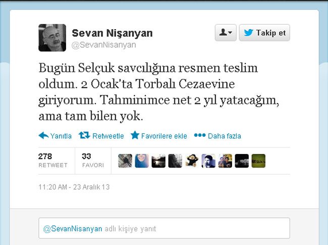 Nişanyan’ın Twitter hesabından teslim olduğunu ve iki yıl hapis yatacağını açıkladı. Nişanyan “Bugün Selçuk savcılığına resmen teslim oldum. 2 Ocak'ta Torbalı Cezaevine giriyorum. Tahminimce net 2 yıl yatacağım, ama tam bilen yok” dedi.
