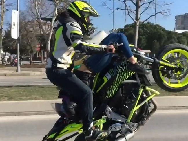 Kız arkadaşlarından birini sırtüstü yatıran motosikletli, akan trafikte araçların arasında metrelerce tek teker üstünde gitti. Hem kendi hem kız arkadaşı hem de diğer sürücülerin canını hiçe sayarak trafikte giden maganda adeta terör estirdi. Trafikteki sürücüler şaşkın bakışlarla motosikletliyi izlerken, maganda o anları kaydettirip bir de sosyal medyadan yayınladı.