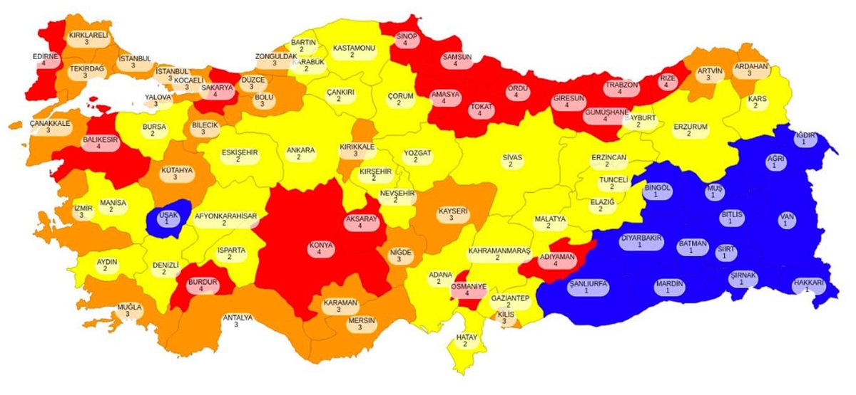 VAKA SAYISINA GÖRE TÜRKİYE RİSK HARİTASI KISITLAMA OLMALIBu konuda uzmanlar şöyle diyor: “Kırmızı bölgelerde ciddi karantina önlemlerinin alınması gerekiyor. İller arasındaki geçişin mutlaka sınırlandırılması gerekiyor. Örneğin Trabzon’dan kalkan bir kişi nasılsa düşük risk var diyerek başka bir bölgeye gitmemeli; gidecekse de ya HES kodu uygulamasıyla ya da başka bir kontrol mekanizması ile bunun yapılması gerekiyor.” Öte yandan İçişleri Bakanlığı’nca dün yayınlanan genelgede ise seyahat kısıtlamasının 2 hafta sonra gündeme alınacağı açıklandı.