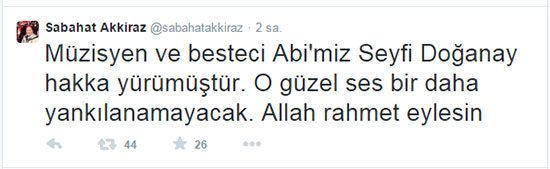 Türk halk müziği sanatçısı, siyasetçi, milletvekili olan Sabahat Akkiraz sosyal medya hesabından Seyfi Doğanay'ın hayatını kaybettiğini duyurdu.