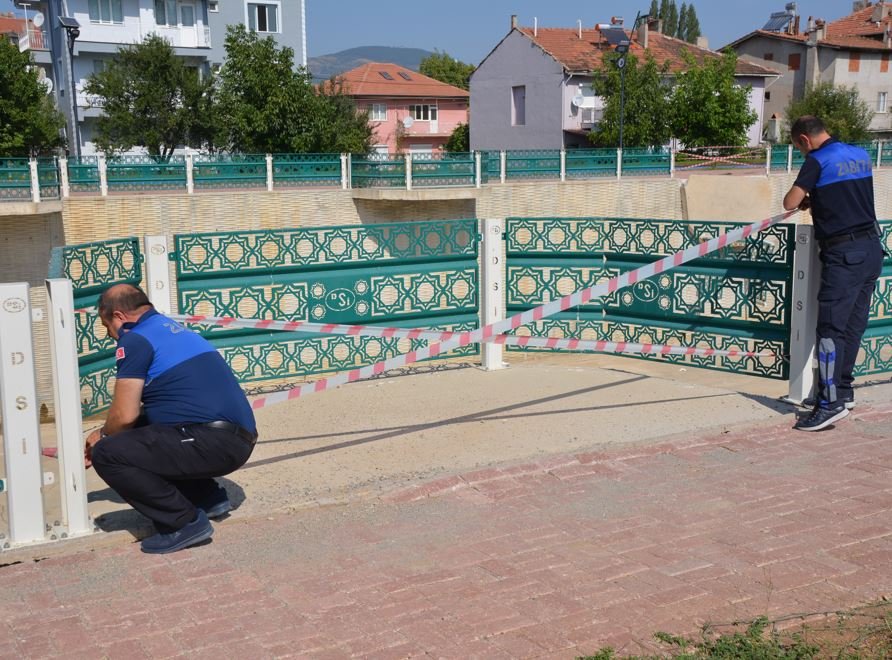 Öte yandan çay üzerinde bulunan diğer seyir balkonları, Banaz Belediyesi ekiplerince şeritle kapatıldı. (AA)