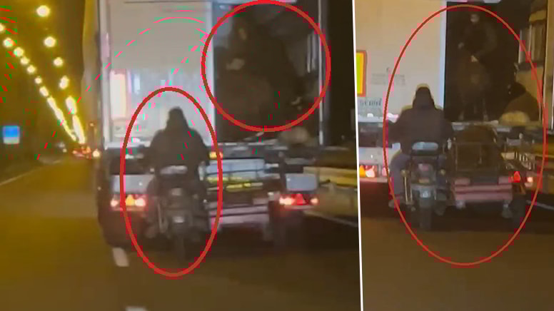 Hareket halindeki canlı hayvan yüklü TIR’a sepetli motosikletle yaklaşan 2 kişi, dorsesinin arka kapısını açtı.