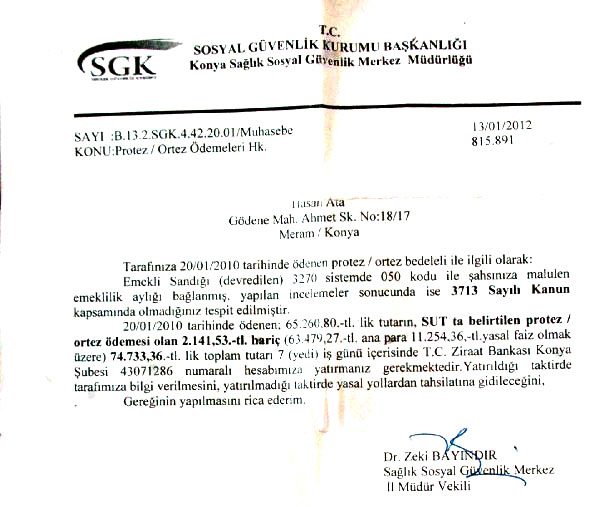 "Protez kullanmaya başladım. Protezlerim eskidiği için değiştirmek amacıyla SGK'ya müracaat ettim. Yeni sistem protez alacağımı bildirdim. Bana bu protezin SGK tarafından ödeneceği yazılı olarak bildirildi. Bunun üzerine 2009 yılında protezimi yaptırdım. Kullanmaya başladıktan 2 yıl sonra yanlış ödeme yaptıkları söyleyerek parasını geri istediler. Parayı ödeyemeyeceğimi söyleyerek Konya 1'inci İş Mahkemesi'ne dava açtım. Şu anda dava devam ediyor. Bu davayı kaybedersen benden de parayı geri isteyecekler. Yeni ikiz çocuklarım oldu ve zaten zorluklar içerisinde geçiniyorum."