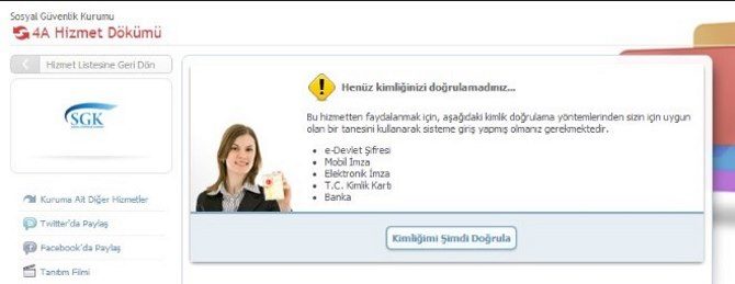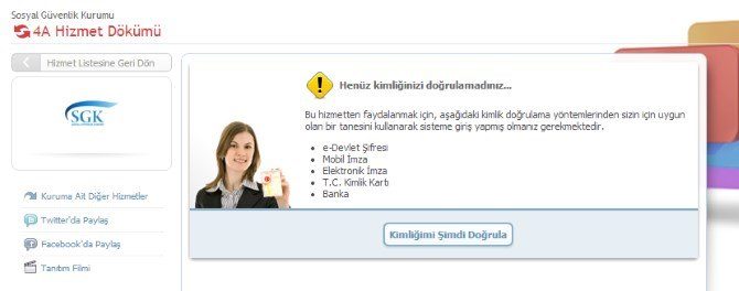 Bu bölümde yapılan giriş işlemleri sonrasında kişiler 4a hizmet dökümüne tıklaması gerekir. Eğer üyelik giriş yapılmazsa, sistem tarafından aşağıdaki gibi bir hata mesajı yayınlanır.