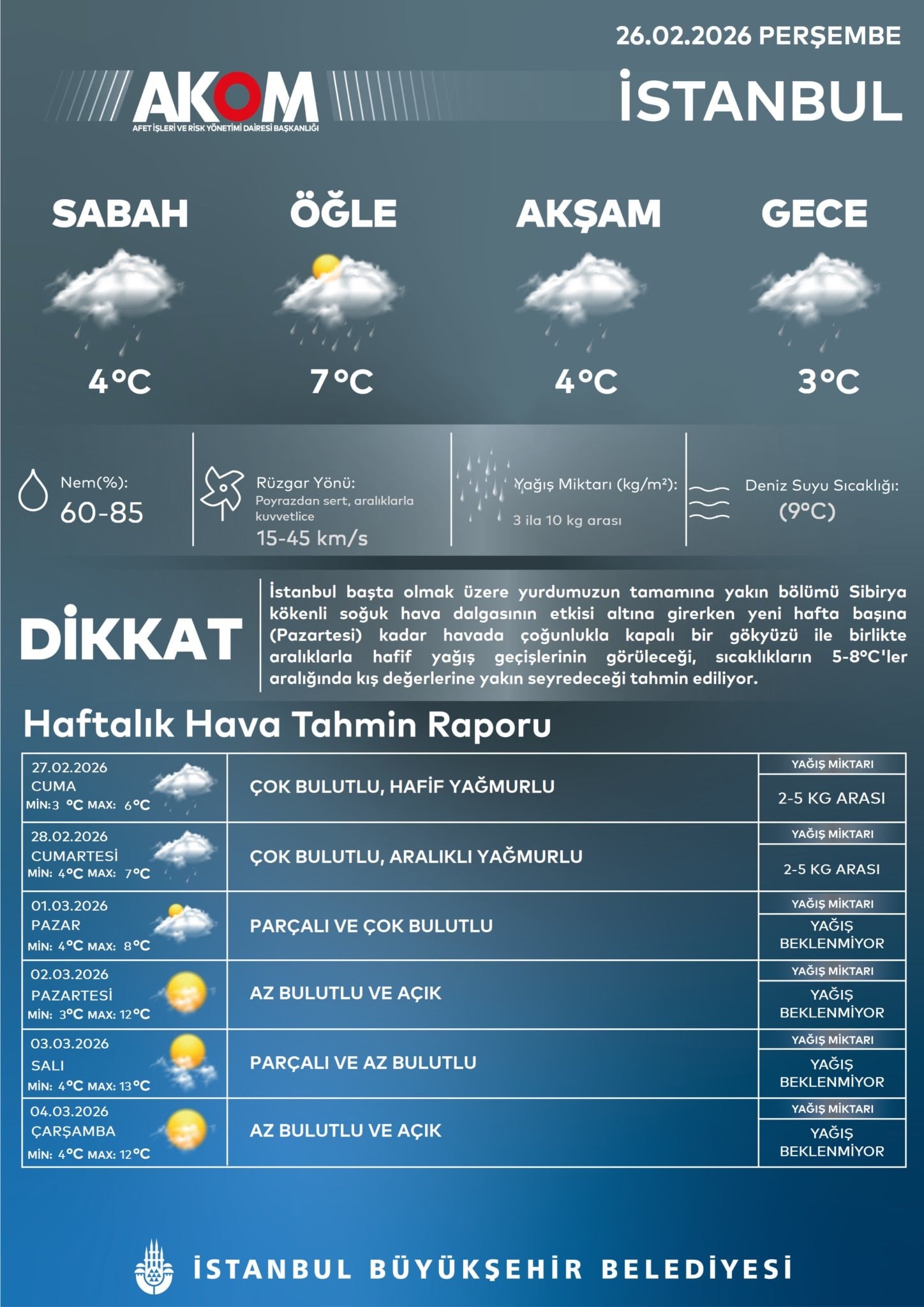 Hava sıcaklığının en düşük 1, en yüksek 8 derece olacağını belirten Valilik, rüzgar uyarısı da yaptı. Rüzgar, İstanbul genelinde kuzey yönlerden saatte 40 ile 60 kilometre hıza ulaşarak kuvvetli esecek.