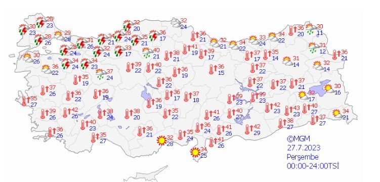 Meteoroloji Genel Müdürlüğü (MGM) tarafından yapılan son değerlendirmelere göre ülkemizin kuzey kesimlerinin parçalı, yer yer çok bulutlu, Trakya Kesimi, Batı Karadeniz (Sinop hariç), Kocaeli, Sakarya, Yalova, Bilecik, Bursa, Eskişehir, Çankırı, Kars ve Ardahan çevreleri ile Balıkesir ve Kütahya’nın kuzey, Ankara’nın kuzey ve batı kesimlerinin yerel olmak üzere sağanak ve yer yer gök gürültülü sağanak yağışlı, diğer yerlerin az bulutlu ve açık geçeceği tahmin ediliyor.