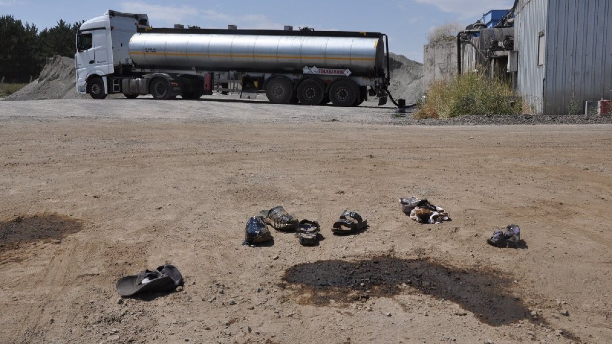 Erzurum'dan tankerle getirilen ve asfalt yapımında kullanılan 150 derece sıcaklıktaki ziftin drenaj kanalına boşaltılması sırada hortum yerinden çıktı.